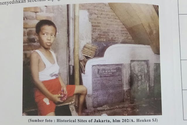 “Itu plangnya,” ujar dia sambil menunjuk sebuah plang bertuliskan `Situs Makam Kuno Kapiten Souw Beng Kong` yang berada di tengah jalan.