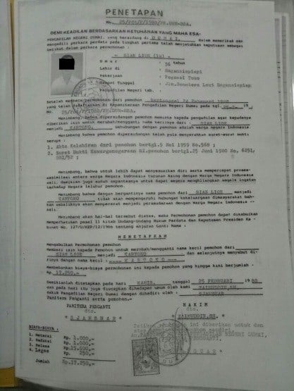 Lalu saya mendapatkan salinan lain dari penggantian nama orangtua mahasiswa saya yang lain, Yulianni. Sang ayah yang bernama Sian Lioe diganti menjadi Hartono.